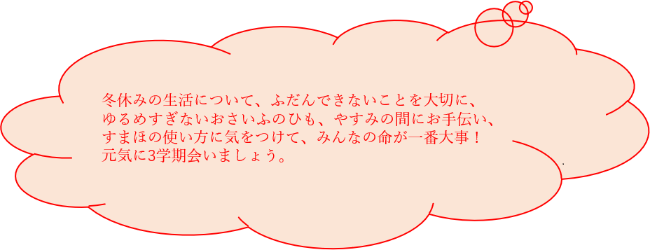 HOME > お知らせ > イベントギャラリー > 12月24日(水)2学期 終業式 12月24日(水)2学期 終業式 入力日2025年12月24日 閲覧数52 終業式 校長先生のお話 失敗してもいい、挑戦を大切にしましょう。 理科研究発表会、大和町人権標語、学童美術展の表彰がありました。 生活の話「冬休みの過ごし方について」 一覧へ戻る 次へ