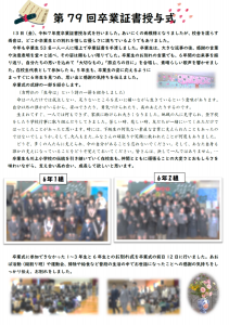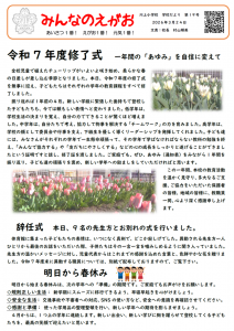 HOME > 2025年度学校だより > 2025学校だよりNo.19 2025学校だよりNo.19 入力日2026年3月24日 内容令和7年度の修了式を迎えました。 振り返れば、1年前の4月に新しい学級に緊張した面持ちで登校した子どもたちも、今では頼もしい表情へと変わりました。 1年間、本校へのご支援とご協力、誠にありがとうございました。 閲覧数8 ファイル ファイルダウンロード 前へ