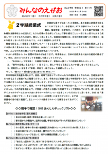HOME > 2025年度学校だより > 2025 学校だよりNo.14 2025 学校だよりNo.14 入力日2025年12月24日 内容2学期を無事に終えることができました。 冬休みは他の長期休業と違い、年末年始家族と過ごす時間が多いと思います。 宿題もありますが、家族の一員として、お手伝いをしっかりして欲しいと思います。 1月8日、元気な子どもたちの会える日を楽しみにしています。 閲覧数29 ファイル ファイルダウンロード 前へ