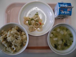 HOME > お知らせ > 今日の給食 > 2月26日(水)栄養を考えて食べよう 2月26日(水)栄養を考えて食べよう 入力日2020年3月10日 閲覧数187 今日の給食は、 ごんぼめし・牛乳・かけあえ・おろしばたの味噌汁でした♪ おろしばたのみそ汁は、『おろしばた』という道具でおろした大根をいれたみそ汁です♬ 前へ 一覧へ戻る 次へ
