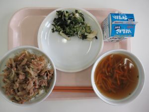 HOME > お知らせ > 今日の給食 > 8月28日(金)ものを大切にしよう! 8月28日(金)ものを大切にしよう! 入力日2020年8月28日 閲覧数148 今日の給食は、 豚丼・牛乳・酢みそ和え・魚そうめん汁でした♪ 食べ物はみなさんの体の中でいろいろな働きをしています♬ 好きなものだけ食べたり、嫌いなものを食べなかったりすると、 体に必要な栄養をうまくとることができません♬ 嫌いな食べ物がある人も、一口は食べてみましょう♬ 前へ 一覧へ戻る 次へ