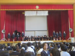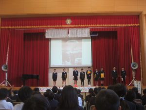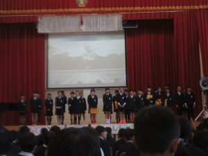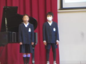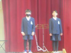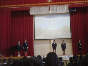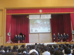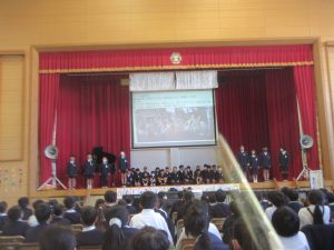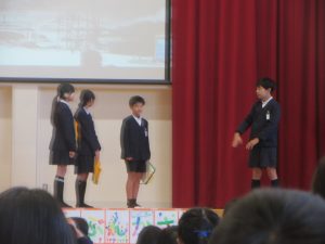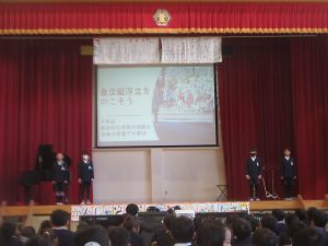 5年生は、総合的な学習の時間と音楽の学習で取り組んだ「金立 鉦浮立」のことを発表しました。6年生は、長崎修学旅行での平和学習を通して学んだことを発表しました。