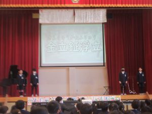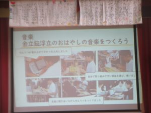 次に、「金立鉦浮立」について調べたことや学んだことを発表し、音楽科の学習でつくった「金立鉦浮立」のおはやしの音楽も発表しました。