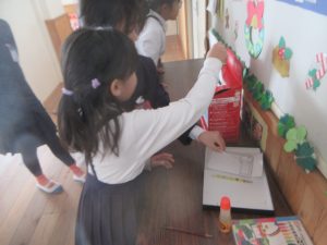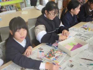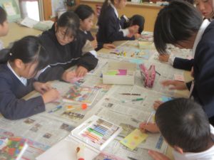 図書室前の廊下には、読書郵便(自分の知り合いにお薦めの本を紹介するハガキを送る)のポストが設置されています。また、この日は、しおりづくりが行われていました。