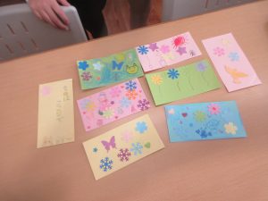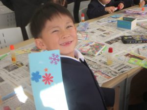 子どもたちの工夫が凝らされたきれいなしおりが出来上がっていました。