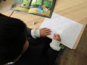 国語の授業で、単元「すきな おはなしは なにかな」の2時間目の授業でした。同じ週に1時間目の授業も行ってのこの日の研究授業となりました。