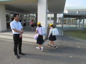 朝から、児童玄関前で子どもたちに声をかけていただきました。