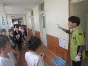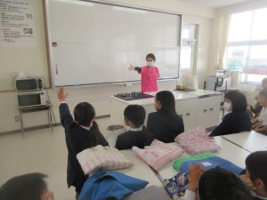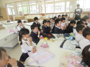 4年1組が健診を受けている間、4年2組は家庭科室で歯科指導を受けました。4年2組が健診の時間は、交代して、4年1組が歯科指導を受けました。