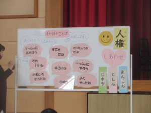 人権の3つの柱は「安心」「自信」「自由」ということで、それぞれについて、どのようなことかをお話ししていただきました。特に、「自由むといいながら、周りに迷惑をかけたり、周りをいやな思いにさせる行為はただの「わがまま」なので、間違えてはいけないということが心に残りました。