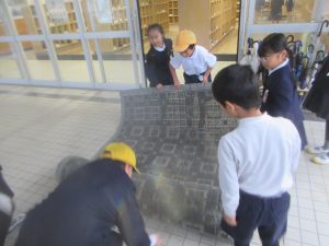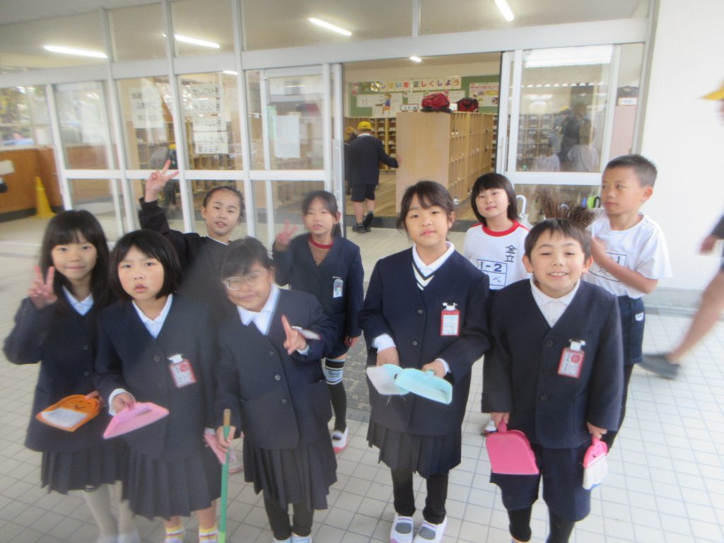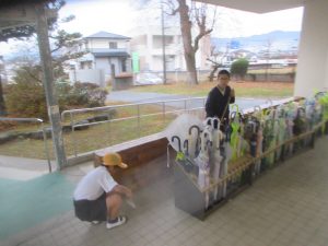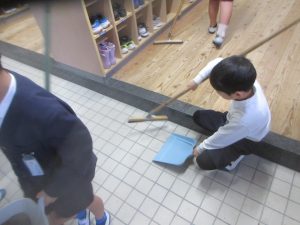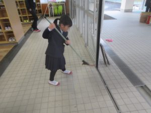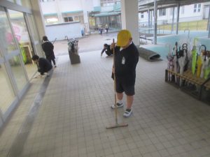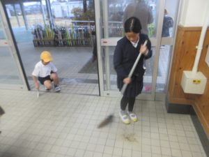 児童玄関の掃除用具が足りなくなるぐらい、たくさんの子どもたちが頑張っていました。