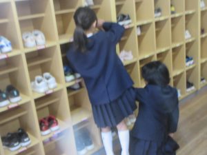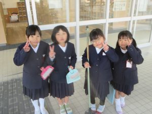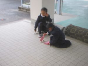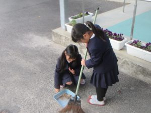 12月24日(水)は2学期最後の日です。登校してくる子どもたちの中にはクリスマスのプレゼントの話をしてくれる人もいました。この日は、雨模様の天気でしたが、7時40分ぐらいには1年生から4年生までのいろいろな子どもたちが、児童玄関を掃除してくれました。