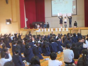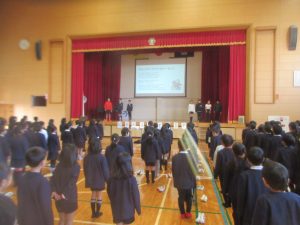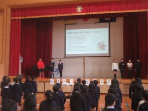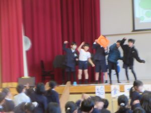 HOME > 学校紹介 > イベントギャラリー > 給食ありがとう集会 給食ありがとう集会 入力日2026年1月29日 閲覧数61 1月29日(木)の朝の時間は、児童集会で、給食委員会の子どもたちの企画による「給食ありがとう集会」でした。 最初に、集会委員会のみんながステージに上がり、今月の歌「勇気100%」を歌いました。 次に、給食委員会の子どもたちが、給食献立表を見せながら、クイズ形式で、栄養のことなどを紹介してくれました。 インフルエンザによる学級閉鎖などで、延期になっていた集会でしたが、給食委員会や集会委員会の子どもたちは事前から準備や練習をとてもよく頑張っていました。 お疲れさまでした。 前へ 一覧へ戻る 次へ