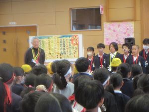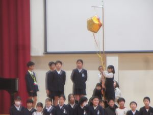 4年1組の子どもたちがつくったくす玉を6年生の代表の子どもたちが紐を引いて、見事に、割れました。