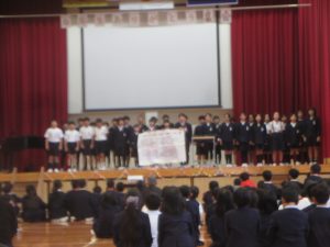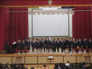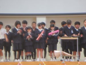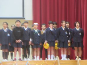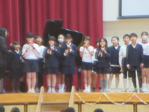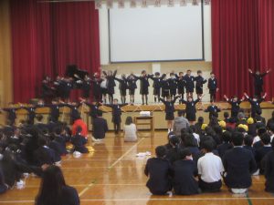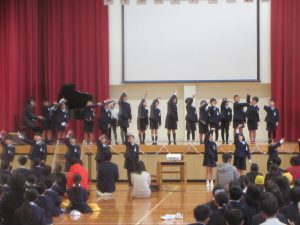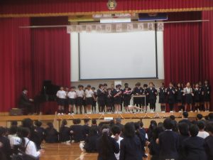 音楽の授業で学習した「とどけよう この夢を」と「歌おう 声高く」を歌いました。「とどけよう この夢を」ではリコーダーチームも加わり、「歌おう 声高く」ではハンドベルも使って、演奏しました。