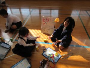 2年生はグループに分かれて、たくさんの遊びコーナーをつくっていて、1年生はそのコーナーを回りながら、2年生がつくったおもちゃで楽しく遊んでいました。