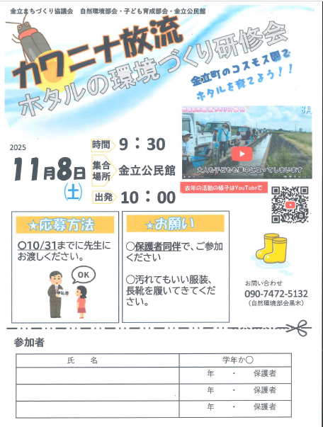 HOME > コミュニティ・スクール > カワニナ放流のお知らせ カワニナ放流のお知らせ 入力日2025年10月15日 内容金立町づくり協議会の自然環境部会、子ども育成部会、金立公民館の共催で、ホタルの環境づくり研修会を行います。 内容は、カワニナの放流です。カワニナはホタルの幼虫であるヤゴのえさとなるので、ホタルの環境づくりに役立つ そうです。 下記の通り、行われます。 ぜひ、親子で参加されてみてはいかがですか。 記 日時 11月8日(土) 集合 9:30 集合場所 金立公民館 出発 10:00 閲覧数12 ファイル ファイルダウンロード 前へ