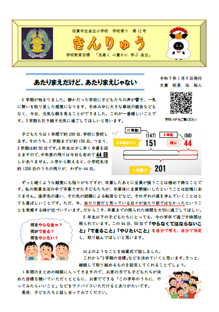 HOME > 学校紹介 > 学校だより > 令和7年度 学校便り第12号 令和7年度 学校便り第12号 入力日2026年1月9日 内容あけましておめでとうございます。 学校便りの第12号は、「あたりまえだけど、あたりまえではない」というタイトルで、始業式に子どもたちにお話しした内容を中心に紹介しています。 特に6年生の子どもたちは、卒業まで残り44日(始業式の日を入れて)となりますので、「やらなくてはならないこと」「できること」「やりたいこと」を自分で考え、自分で決定し、取り組んでほしいものです。 ぜひお読みください。 下のファイルを開いていただくと拡大してお読みいただけます。 閲覧数62 ファイル ファイルダウンロード 前へ