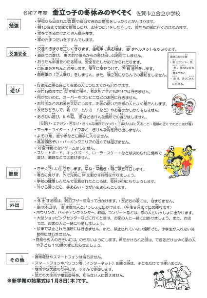 そして、「金立っ子の冬休みのやくそく」をよく読んで、(1年生や2年生はお家の人といっしょに読んで)しっかり守りましょう。みなさんの手元にありますよね。