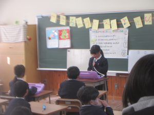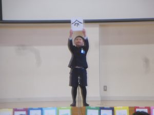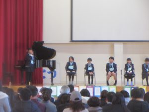 4年生は、音楽の学習で学んだ「いいことありそう」と「風のメロディ」の合唱奏、総合的な学習の時間に学んだ「福祉」についての発表、そして、漢字一字で、自分が頑張りたいことや将来のことについての発表、そして、「大切なもの」の合唱とお家の方への手紙と、プログラムいっぱいでしたが、最後までお付き合いいただき、ありがとうございました。