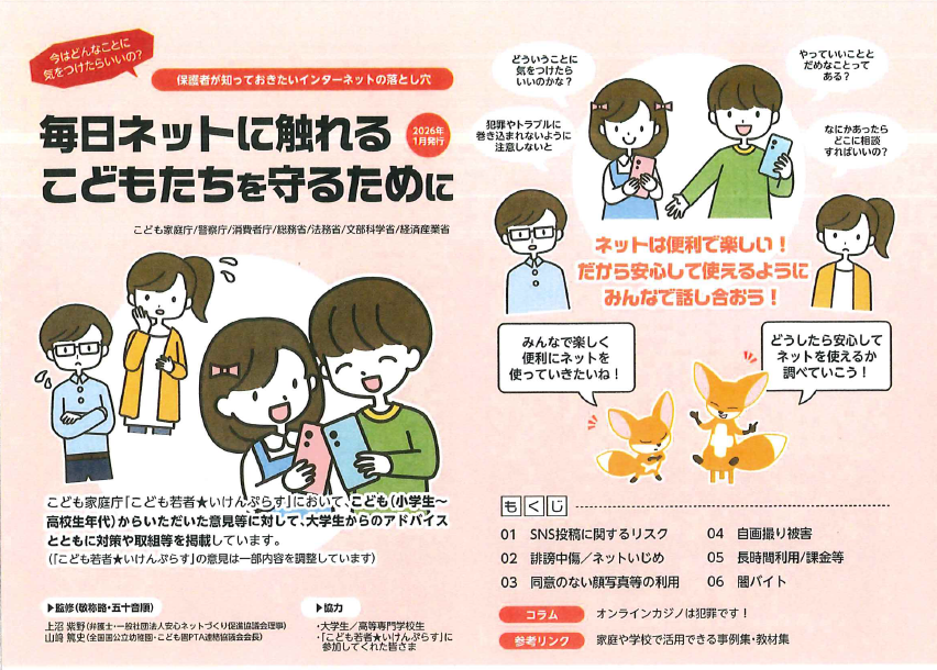 そこで、毎日、ネットに触れる(可能性がある)子どもたちを守るために、ぜひ、保護者が知っておいてほしいこと(SNS投稿に関するリスク、誹謗中傷やネットいじめ など)について、下記のファイルに紹介していますので、ぜひ、ご覧になってください。