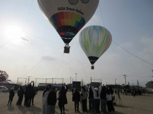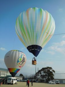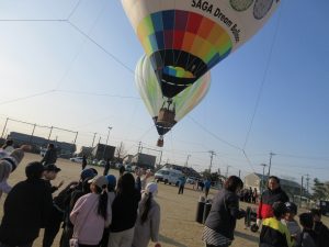 1/29(木)、昨年の12月に予定していて、天候不良で延期していた「バルーン係留体験」が行われました。150周年記念の空撮でもお世話になった水町さんをはじめ、佐賀市からたくさんの方々が早朝より来てくださり、準備をしてくださいました。登校する子ども達は運動場でだんだん広がっていくバルーンに夢中でした。係留は2機のバルーンで学年同時に行っていきました。バーナーの火の熱で浮かんだり降りてきたりするバルーン体験に、上空からも地上からも笑顔で楽しそうに手を振り合っていました。寒い中ではありましたが、子ども達は貴重な体験になったと思います。ぜひまた行ってほしいです。