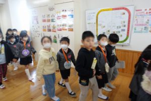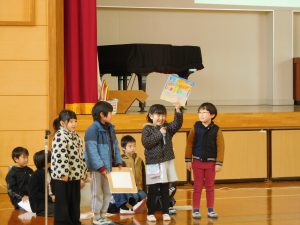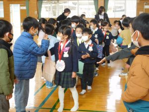 2月4日(水)、錦華幼稚園さん、巨勢保育園さんで来年度小学校に入学する予定の年長さんに巨勢小学校に来てもらいました。本校の1年生が、先輩として年長さんたちを迎えて、クイズなどを用いて小学校のことを分かりやすく紹介していました。また、お兄さんお姉さんらしくしっかり手をつないで、実際に1年生教室にいき、イスに座ってもらい、机で勉強気分を味わってもらいました。心をこめて作ったメダルも渡すことができました。1年生になること、楽しみになってくれていれば嬉しいです。4月、新1年生として入学してくるのをみんなで待ってます!