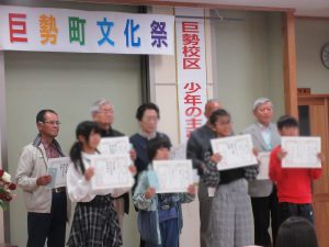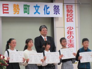 11/14(金)と15(土)と巨勢町の文化祭が行われました。例年、巨勢小学校とも組み合わせて行っていましたが、今年度は「巨勢小学校150周年記念」が11/16(日)に行われることもあり、それぞれで行う形式でした。習字や絵画、詩歌などいろいろな展示や発表がありましたが、その中で、巨勢小学校からは5,6年生は「少年の主張」、「詩歌祭り」に、また各学年から絵画や立体作品を展示という形で参加しました。少年の主張では代表者5名が各々の考えていることをしっかりと述べることができました。また、詩歌祭りでは、たくさんの作品の中から賞に入った子の表彰がありました。地域で習っている習字やダンスの発表もあり、楽しい文化祭になったと思います。