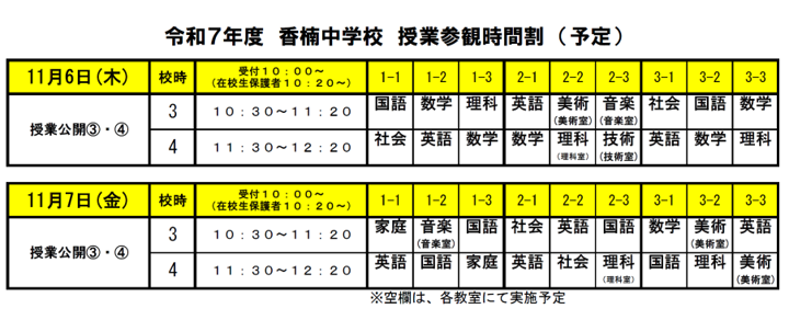 HOME > お知らせ > 学校からのお知らせ > 「授業参観」当日の時間割について 「授業参観」当日の時間割について 入力日2025年10月23日 内容令和7年11月6日(木),7日(金)に開催される「授業参観」の当日の時間割(予定)をお知らせいたします。 閲覧数15 前へ