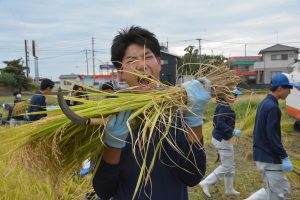 初めて稲刈りを行う1年生は、鎌を使って手作業で刈り取り、稲の重みや香りを直接感じながら、収穫の大変さと喜びを学びました。