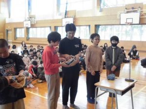 今朝(1/16)、市教委より大谷選手からのグローブが学校に届きました。さっそく、お昼に臨時の全校集会を開き、贈呈式を行いました。大谷選手からのメッセージを読み上げ、児童代表として6年生の各委員長6人にグローブを渡しました。また、唐津上場商工会青年部の『こども応援し隊』より野球ボールの寄贈もありましたので、一緒に渡しました。その後、5,6年生の代表二人でキャッチボールをしてもらいました。子供たちは大喜びでした。グローブは、全クラスに順に回して全員が触れるようにし、その後グローブを使ってキャッチボール等ができるようにしたいと考えています。