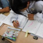 「表現の工夫を見つけ、物語のおもしろさについてリーフレトをかこう」という単元のゴールを決めて、学習を進めていました。今日の授業では、自分が見つけた表見のひみつを考える授業でした。子供たちは、自分の考えをしっかり書くことができていました。