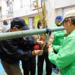 竹にかけた縄を堅くねじっていくのが難しかったようです。サポーターの皆さんの手助けで完成しました。仕上げに扇や国旗、伊勢エビ等の縁起物の飾りをつけました。