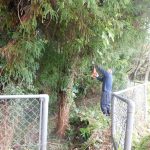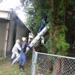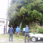 環境チームのみなさんには、東側フェンス下の雑木林の草刈りと伐採作業をお願いしました。今回、学校運営協議会の皆様にもご協力いただきました。高いところの登っての伐採や丸太の移動などがんばっていただきました。。