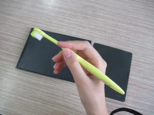 えんぴつ持ちにすることで力を入れなくても磨けることや歯肉を痛めることも少ないとのことでした。また、歯ブラシの毛先が開いていると汚れが落ちにくいので、2か月に1回は変えたほうが良いと教えていただきました。