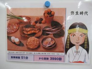 また、弥生時代の食事では、時間をかけてよく噛んで食べていたこと、現代では短い時間で噛む回数が減っていることなども教えてもらいました。噛むことで唾液が出るので、むし歯の予防には、よく噛んで食べたほうがよいそうです。