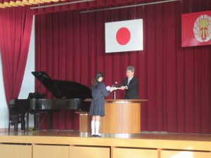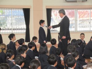 修了式後は、1年間を通しての多読者や3学期に行われた新年書き方会などの表彰をしてもらいました。