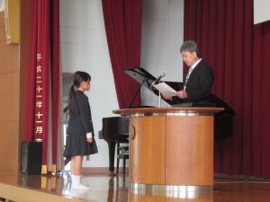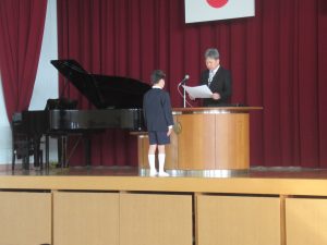 5年生の代表児童が「修了証書」をもらいました。