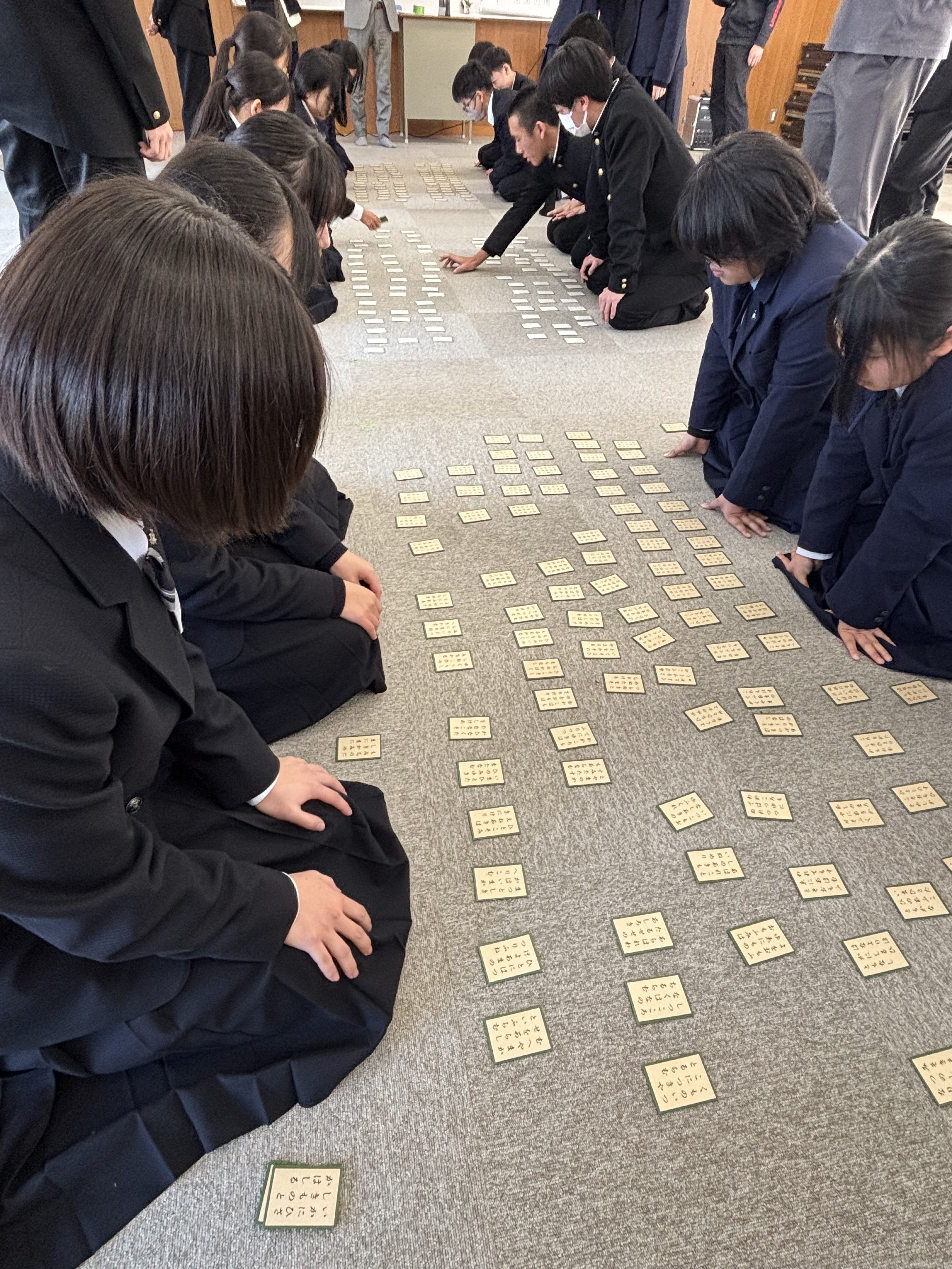 HOME > 学校生活 > 学校行事 > 始業式・カルタ会 始業式・カルタ会 入力日2026年1月14日 閲覧数104 1月8日(木)進行は生徒会・司会は放送部が行い、生徒主体の始業式をオンラインで行いました。 午後は、養基会館で新春百人一首カルタ会が開催されました。1・2年生の生徒達が3人1組のグループを作り、クラス対抗で熱戦を繰り広げました。優勝は初参戦の1年生チームでした。 前へ 一覧へ戻る 次へ