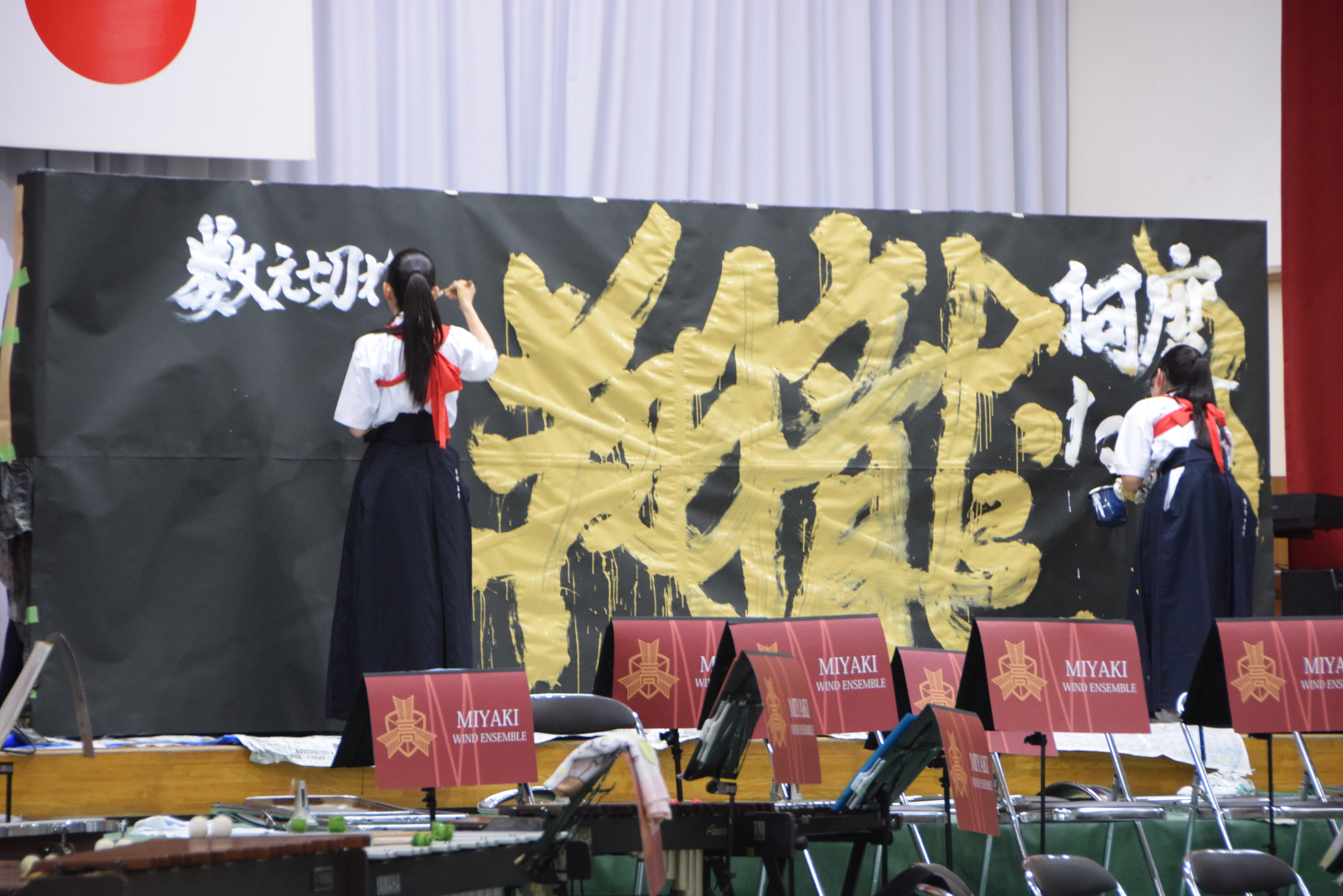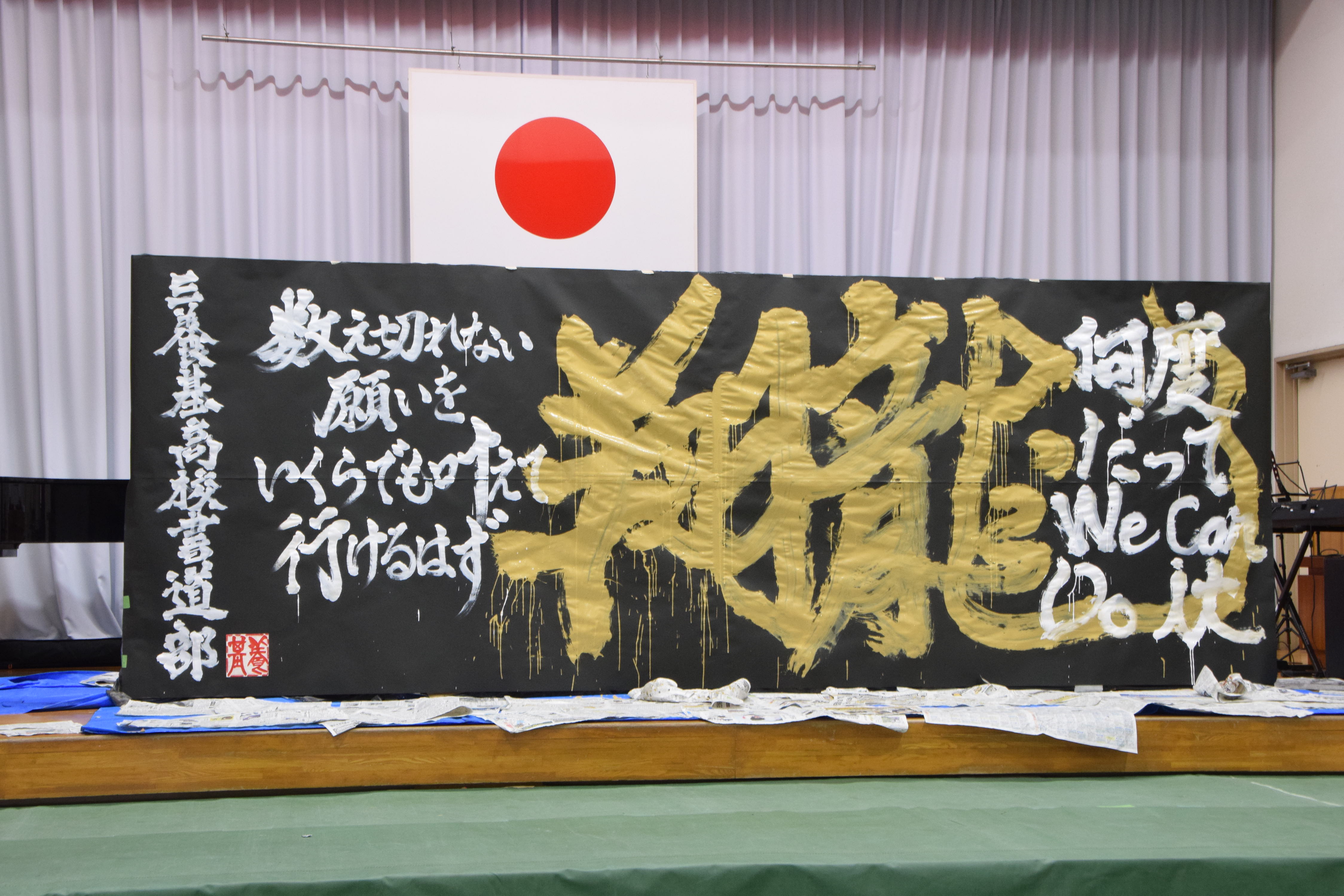 私たち書道部は、3年生3名、2年生8名、1年生4名で活動しています。活動は、年に4,5回行われる大会や展覧会への出品が中心となります。また、文化祭では書道パフォーマンスを披露します。経験がない人でも週に1回専門の先生に指導してもらえますので、どんどん上達していきます。騒がしい日常から離れて、墨の香りに癒されながら、自分と向き合いたい人にはぴったりの部活動です。
