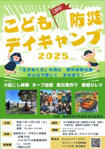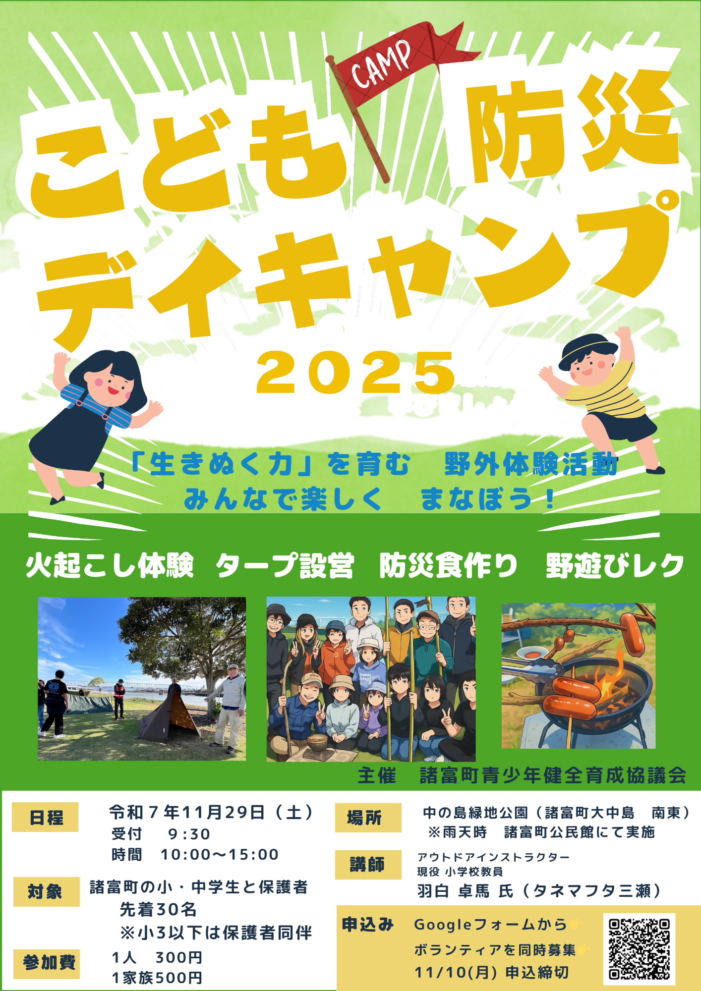 HOME > その他お知らせ > 「こども防災デイキャンプ2025」のお知らせ 「こども防災デイキャンプ2025」のお知らせ 入力日2025年10月15日 内容諸富町青少年健全育成協議会主催のイベントのお知らせです。 詳しくは 下記ポスターをご覧ください。 閲覧数5