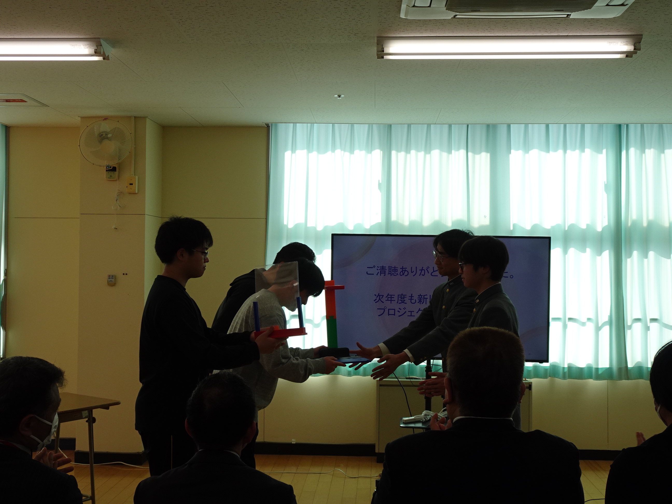 令和8年3月17日(火)に、本校寄宿舎のプレイルームにて佐賀工業高校との教育連携プロジェクトの成果発表・贈呈式を行いました。