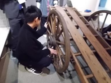 一つ目は、収穫した米などを運ぶ荷車です。最初に柄を持ち上げ重さを体感した後、全体を伝いながら大きさをつかみました。次に、車輪の大きさをイメージした後、実際に触って大きさを確かめたり、木と鉄でできていることを確認したりしました。展示室の中で、荷車を操作し右に回しながら動かしてみました。