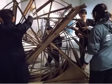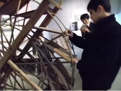 二つ目は、水車です。全体を触察した後、踏み車を手で回しました。実際は、竹馬のような棒を使い、一番上まで登って足で踏み回していたそうです。ポンプがない時代は、人力で田に水を引いていたそうです。