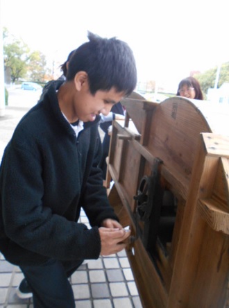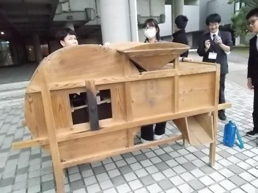 三つ目は、唐箕(とうみ)です。風の力でもみ殻やごみを吹き飛ばす道具です。ハンドルを回して作業を体験しました。また、風の吹き出し口に立ち、勢いよく送られてくる風を感じました。