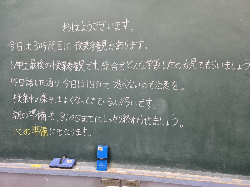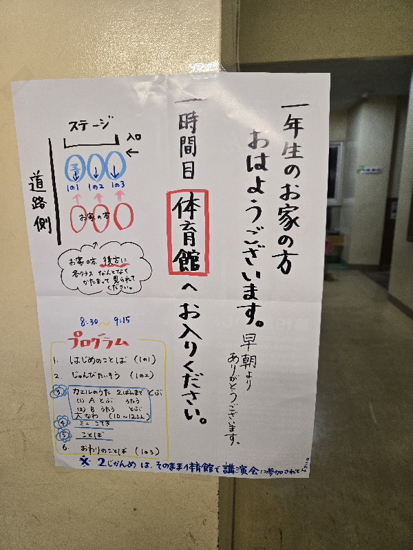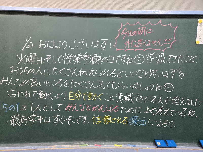 HOME > イベントギャラリー > 0120 今日のパチリ 0120 今日のパチリ 入力日2026年1月20日 閲覧数354 教室は全館エアコンがあり暖かいです。廊下から参観はやや寒さあり 7:10体育館温度9度 防寒対策なさってください ひざ掛け等あればベターです。 運動場駐車場です。参観は多いと見込んでいます。注意して、事故等ないようにおいでください。 前へ 一覧へ戻る 次へ