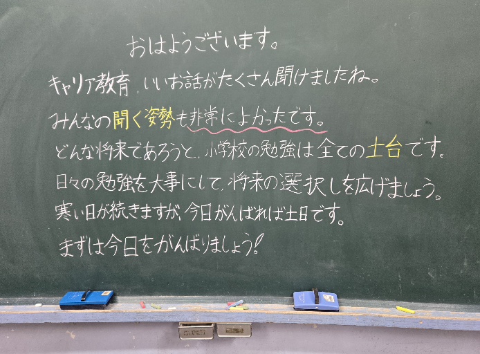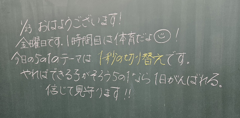 寒い朝が続きます。昨日、某食事店へいきました。すると、保護者様がいらしてお声かけをしていただきました。「校長先生、在任あと2か月ですね。がんばられてください。よろしくお願いします!」その言葉が有難かったです。