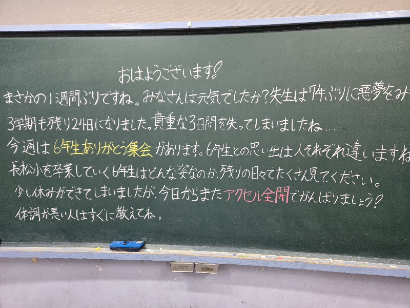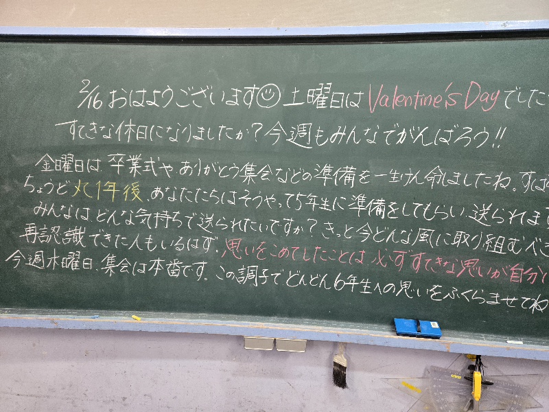 HOME > イベントギャラリー > 0216 今日のぱちり 0216 今日のぱちり 入力日2026年2月16日 閲覧数400 6年生ありがとうにむけて準備をぱちり 朝の飛行機雲 ぱちり 4の1と5の2 ぱちり!登校できてよかったです 前へ 一覧へ戻る 次へ