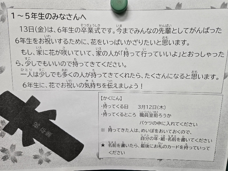 HOME > イベントギャラリー > 0310 今日のぱちり 0310 今日のぱちり 入力日2026年3月10日 閲覧数189 3月12日木曜日に ご自宅に花があるご家庭はご協力くださいとあります。わざわざご購入なさらず、お花があるご家庭はぜひご協力お願いします。ただし木曜日のみ集める日となります 卒業式の週 たくさんの花も見送り準備です 前へ 一覧へ戻る 次へ