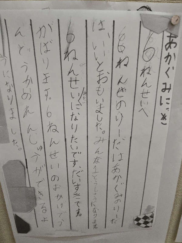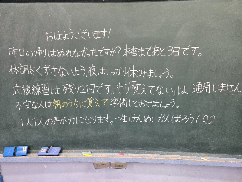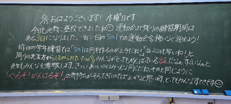 HOME > イベントギャラリー > 1015 今日のパチリ 1015 今日のパチリ 入力日2025年10月15日 閲覧数282 テルテル坊主を飾る教室がありました。ぱちり。6年生のリーダーに色ごとの手紙を見つけました。ぱちり。手紙の内容を全校放送で伝えたくなりました。今朝1時間目の応援練習が24度でした。日曜日も同じ温度が最高気温で,きっと肌寒い運動会になる予報がでています。 子どもたちの気持ちは日曜日 大運動会に向かっています。しっかりサポートします!快晴にむかいますように! 前へ 一覧へ戻る 次へ