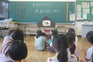 HOME > お知らせ > イベントギャラリー > 6/27紙芝居発表会 6/27紙芝居発表会 入力日2022年6月27日 閲覧数358 1年生が国語の時間に学習した「大きなかぶ」を紙芝居にして、昼休みに上級生を招待して発表会を開いています。「うんとこしょ どっこいしょ」の繰り返しが楽しい話です。上級生も1年生の頃を思い出しながら聞いているようでした。 前へ 一覧へ戻る 次へ